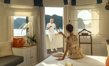 Stay in comfort in spacious cabins and suites, each one featuring spectacular views of Ha Long Bay.