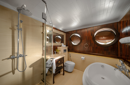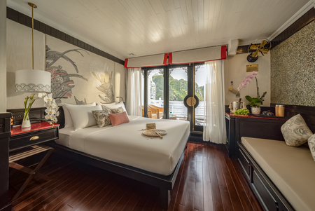 Sprawling over 40 square metres, the Long Quan Suites are the most spacious on board. Floor-to-ceiling doors open to a private balcony with chairs and sun loungers, capturing sweeping vistas of Ha Long Bay. Along with cabin amenities, these suites include a freestanding bathtub, shower, flower and fruit basket, and a complimentary bottle of sparkling wine.