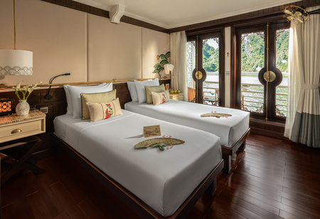 Ideal for travellers who enjoy quiet comfort and serene views, the Au Co's two Grand Deluxe Cabins are situated at the rear of the Upper Deck. Spanning 20 square metres, these cabins feature panoramic windows to take in the scenery, along with all the amenities of Deluxe Cabins.