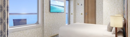 Your picture window gives you a view beyond your stateroom, to the observation deck outside, including a great sky view. (Note: view will be partially obstructed.)