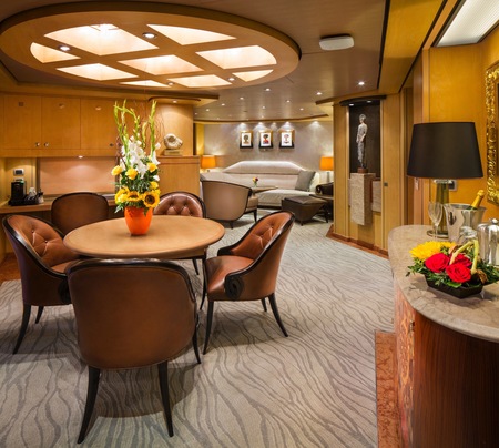 Generously proportioned and filled with light, these elegant suites include a living room, dining room, pantry with microwave and refrigerator, and floor-to-ceiling windows overlooking a private verandah with whirlpool. The bedroom features a king-size bed—our Signature Mariner's Dream™ bed with plush Euro-Top mattresses, plus a separate dressing room and the bath includes an oversize whirlpool bath and shower as well as an additional shower stall. There's also a sofa bed, suitable for two people, and a guest toilet. Amenities include a private stereo system, use of the exclusive Neptune Lounge, private concierge and an array of complimentary services.