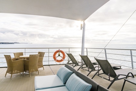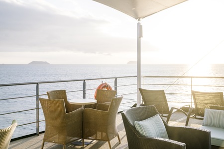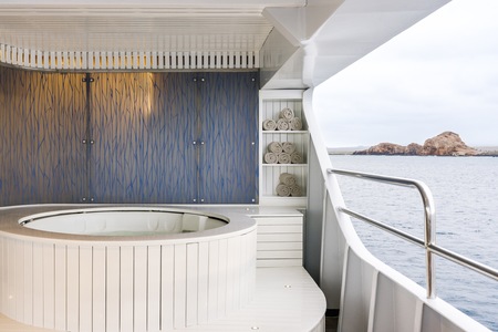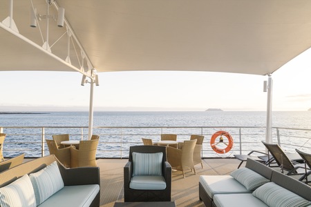 The Sky deck offers spaces where guests can relax and enjoy their Galápagos expeditions basking in the sun at the very top of the ship. The sun deck and fitness room are located here.