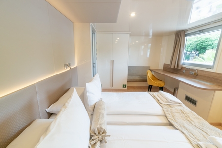 The sense of luxury continues within your cabin. There are a total of 19 stunningly presented cabins, all light, bright, generously proportioned between 14-17 square metres (151 - 183 square feet) and elegantly styled with maximum comfort in mind. With luxurious double or twin beds and contemporary fittings all cabins are fully air-conditioned, feature a writing desk and chair, wardrobe, safe, hairdryer, TV plus a cleverly designed bathroom with shower. Free Wi-Fi is also available on board.