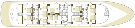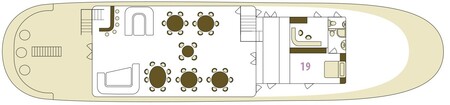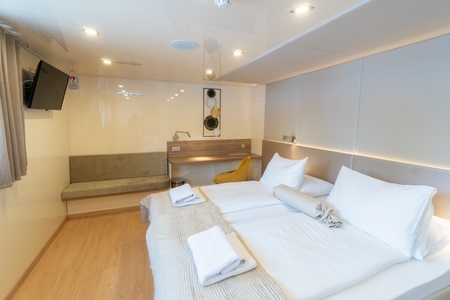 There is one A+ cabin on the upper deck measuring approximately 17 square metres (183 square feet) which features 2 single beds which can be made up as a double or separated as a twin with one large opening window.
