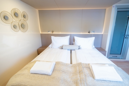 Located on the main deck and measure approximately 14 - 15 square metres (151 - 161 square feet) and feature 2 single beds (exception for cabins 15-18 double bed only) which can be made up as a double or separated as a twin with one large opening window in the cabin and a small opening window in bathroom.