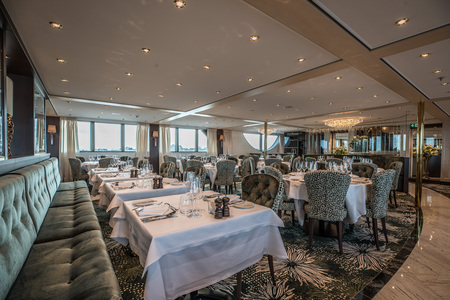 The ship’s main restaurant is located on the Ruby (middle) Deck and here you will experience not only exceptional first class cuisine, but also the most attentive yet discreet service from the ship’s highly professional crew. So just sit back with a well-deserved glass of wine from the carefully selected wine list and delight in the wonderful elegance of your surroundings; beautifully laid tables for just 4 or 6 guests, crisp linen, deep wool carpets and warm wood panelling abound to offer a delectable dining experience of the highest order.