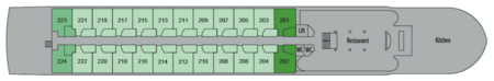 The cabins are 16 square metres, featuring a fixed window overlooking the river. It also includes air conditioning, hairdryer, safe, TV, telephone, desk, lounge chair and table and tea/coffee-making facilities. The hotel-style beds can be configured as a double or twin, and the modern ensuite bathroom features a relaxing rain shower.