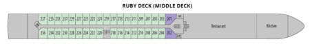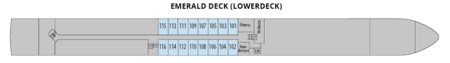 Suites on the Emerald Deck are slightly smaller, measuring approximately 16 square metres (172 square feet) and have smaller fixed windows. Some are available for sole occupancy (supplements may apply) and are subject to availability.