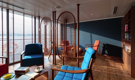Located on the Panorama deck, these deluxe cabins are a roomy 25 square metres. Decorated in a calming palette of earthy tones, creating a sense of understated elegance, with floor-to-ceiling windows that open onto a private balcony, framing picturesque views of the riverbanks as we cruise by.