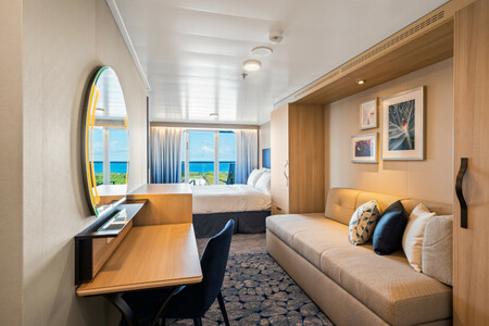 This stateroom offers a floor-to-ceiling, wrap-around panoramic window.