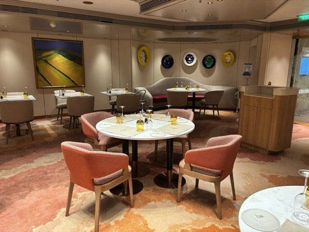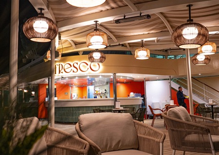Fresco, our new Mediterranean-inspired venue with alfresco seating, designed for relaxed, sun-soaked dining and panoramic views. This lovely new are features gently changing ambient light features, a refreshing pediluvio foot spa experience and, weather permitting, a spotlight stage for intimate live performances - perfect for unwinding in warmer cruise destinations. At Fresco, you will bea ble to enjoy a tempting selection of light bites, and on select evenings, the venue will transorm into an inviting lounge deck under the stars.